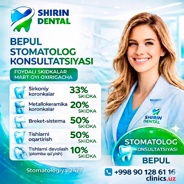 Mart oyi oxirigacha bizning klinikamizda stomatologik xizmatlarga foydali skidkalar amal qiladi, stomatolog konsultatsiyasi esa BEPUL o‘tkaziladi.